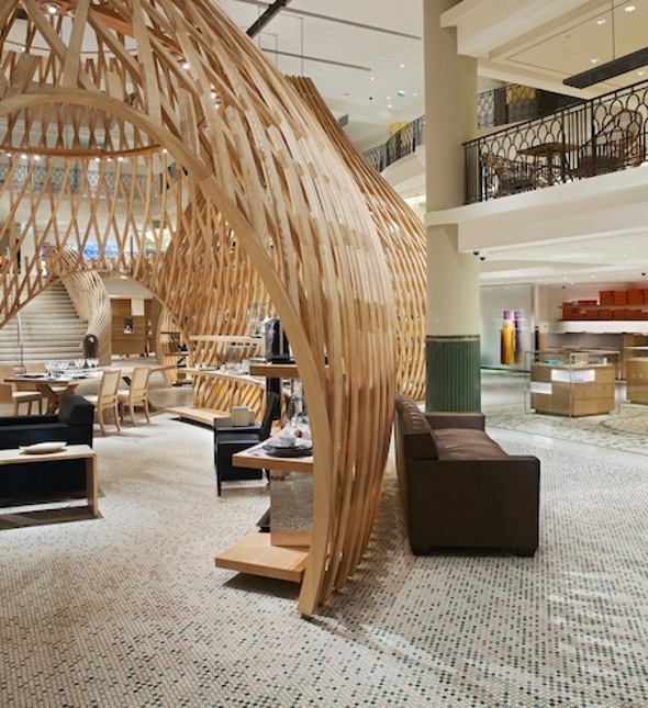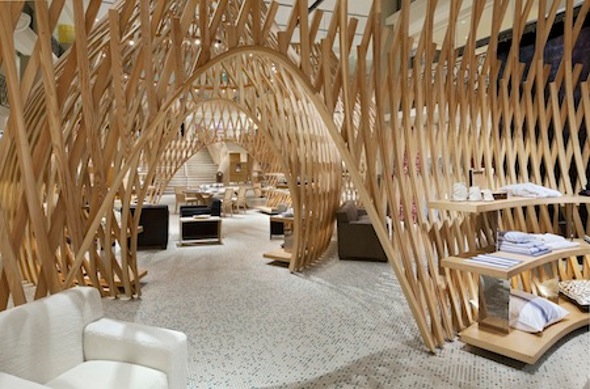 Looking like huge nests made out of lathe, the new interior of the Hermes boutique in Paris looks warm and inviting. Envisioned by the design house Rena Dumas architect, there are three large organic structures rise from the floor creating implied rooms to house Hermes products.